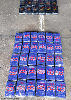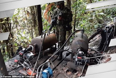 ![]() | The lab averaged production of 16 tons. The military discovered 2,026kg of cocaine that was set to be shipped out. Agents also found 904kg of cocaine paste, which is obtained when cocaine is extracted from the coca leaf. Soldiers on site also found a hydropump, a vacuum, a compressor, eight digital scales, 10 microwave overs, two filtration equipments and at least 360 tags that were used to identify the cocaine packages. Five members of the Alfonso Cano Occidental Bloc were arrested and another purported associate was shot dead. |