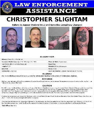 | Christopher Slightam is wanted in connection with an investigation into the Hell’s Angels outlaw motorcycle gang operating in New Rochelle, New York. Slightam was released on bail after being arrested and charged in February of 2017 on federal RICO and narcotics conspiracy charges.