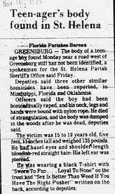 ![]() | Victim Daniel Dewey “was bound alive with [an] elaborate rigging. Knotted ropes lashed him wrist-to-wrist, ankle-to-ankle, wrists-to-ankle. Another cord was wrapped around his neck to his feet. The more the victim squirmed to break free, the tighter the ropes constricted his breathing until he was asphyxiated.” For 29 years his headstone read simply: “Unidentified Homicide Victim.” |