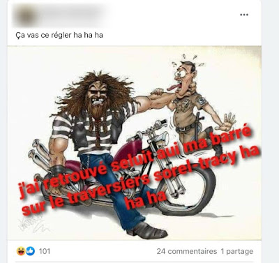 | Hells Angel Serge Lebrasseur appealed his 4 month sentence for being an intimidator at a ferry terminal in 2019. He was arrested for breach of conditions and is back in jail. He thought it would be funny to threaten folks on Facebook. The semi-amazing biker likely isn't laughing now. | ![]() |