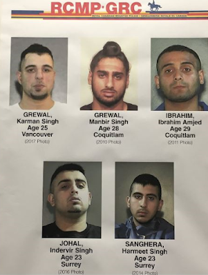 ![]() Manbir Singh Grewal | The targets are identified as 25-year-old Karman Singh Grewal from Vancouver, 28-year-old Manbir Singh Grewal and 29-year-old Ibrahim Amjed Ibrahim from Coquitlam, 23-year-old Indervir Singh Johal and 23-year-old Harmeet Singh Sanghera from Surrey. All refused to provide statements or information. Ibrahim Amjad Ibrahim was found shot dead in Richmond in October 2017. | ![]() |