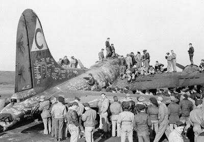 | B-17F 41-24577 "Hells Angels" was assigned to Bangor on Oct 14, 1942. It completed 48 missions without an abort or a crewman injured. It returned to New Jersey on 10 February 1944 for a War Bond tour. 'Hells Angels' was the first aircraft to complete 25 missions, earlier than the Memphis Belle. The event was important because it proved to flight crews it was possible to survive. The statistics of bomber losses were grim: most crews were gone by their fifth mission. Statistically, a man flying his sixth mission was “on someone else’s time.”  |