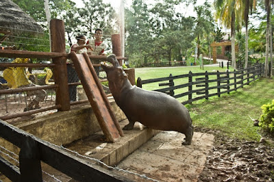 | A growing herd of hippos, the offspring of 4 bought in the 1980s for Escobar’s zoo, still roam the area. There’s also a former bullring.